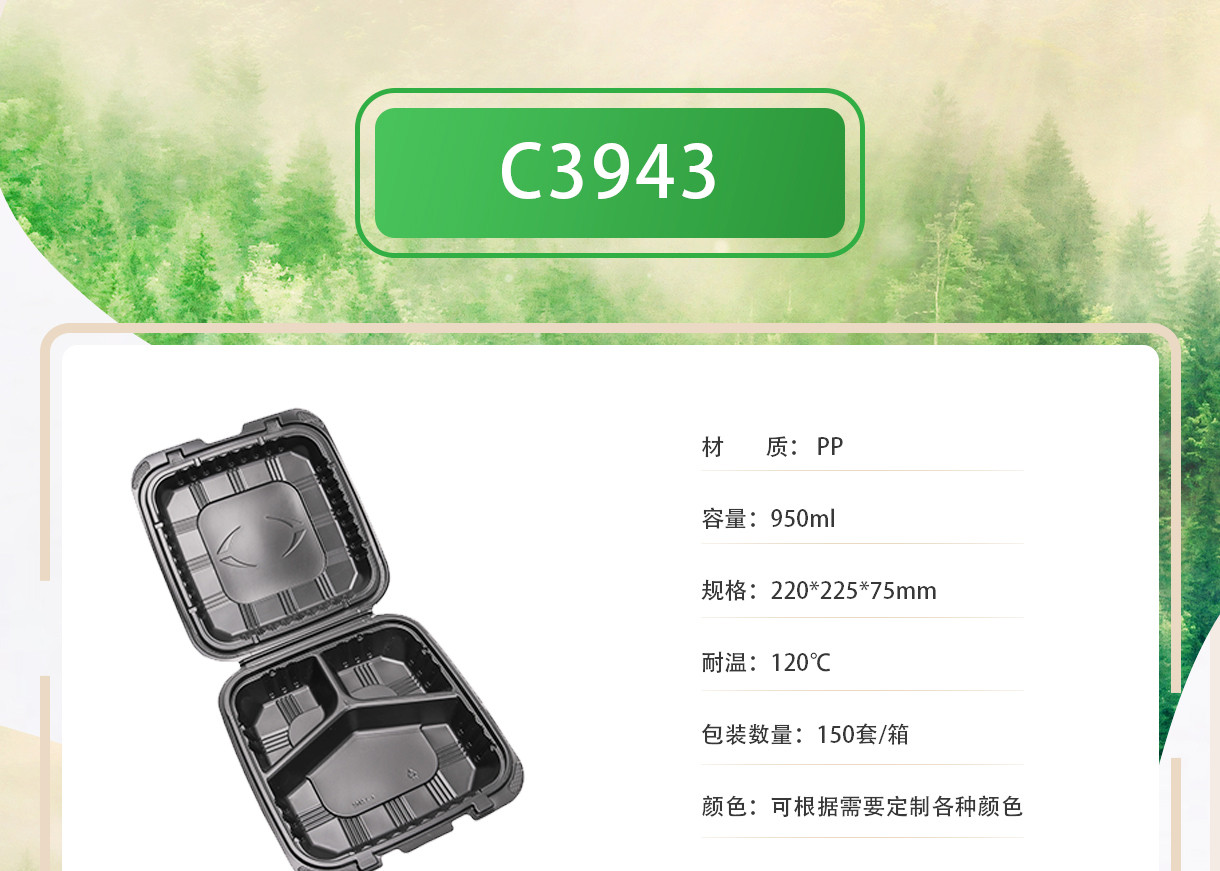 一次性pp飯盒帶蓋封口黑色方形三格格快餐盒